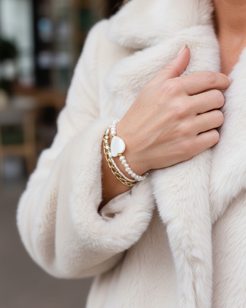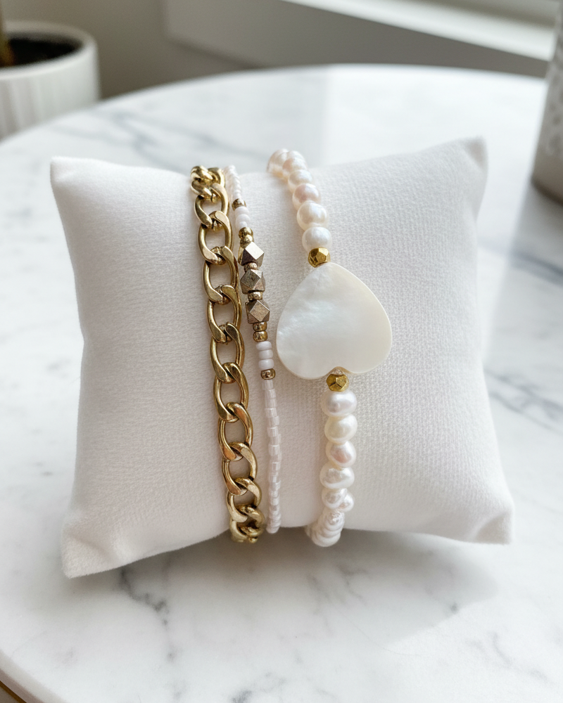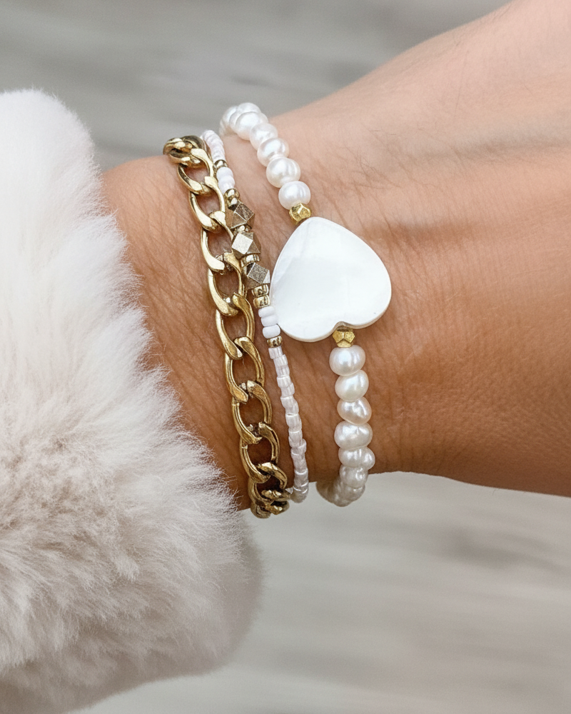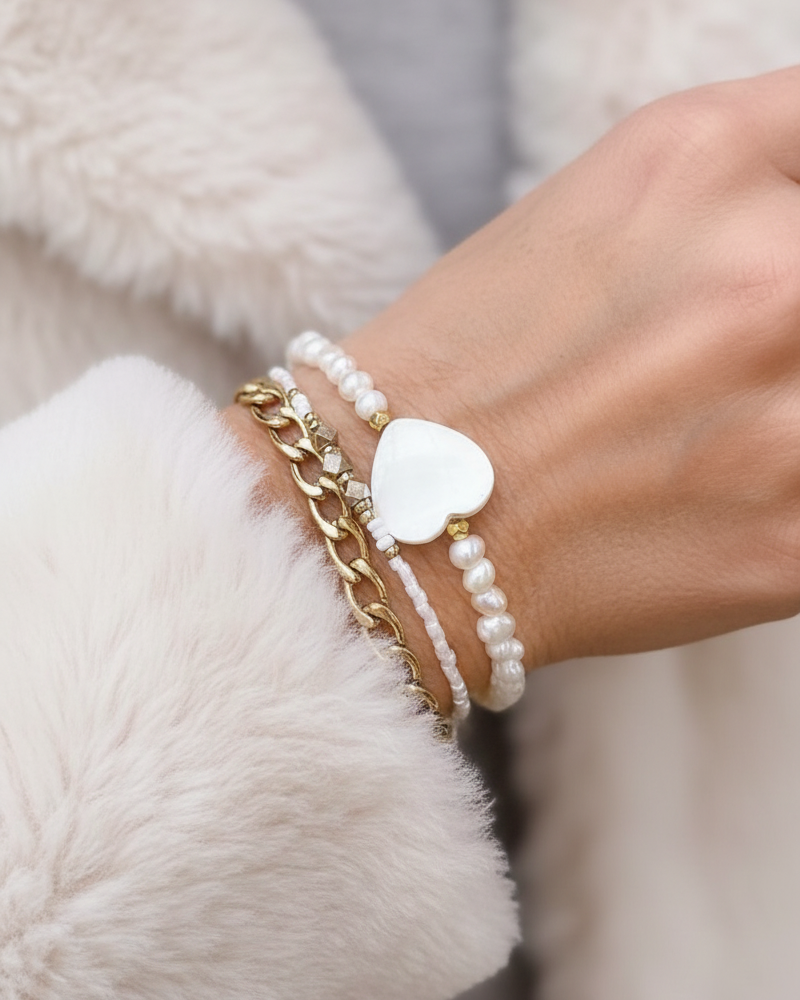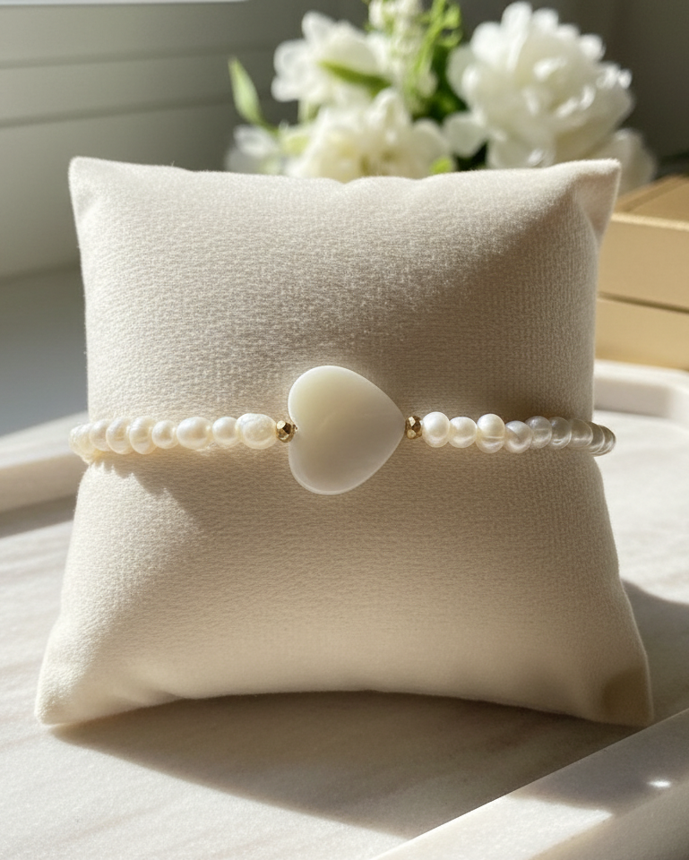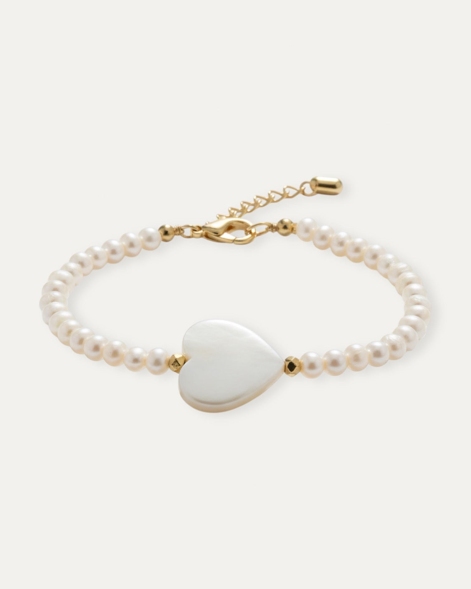 A beautiful bracelet made with mother-of-pearl beads combined with gold-plated beads and a heart-shaped mother-of-pearl pendant.