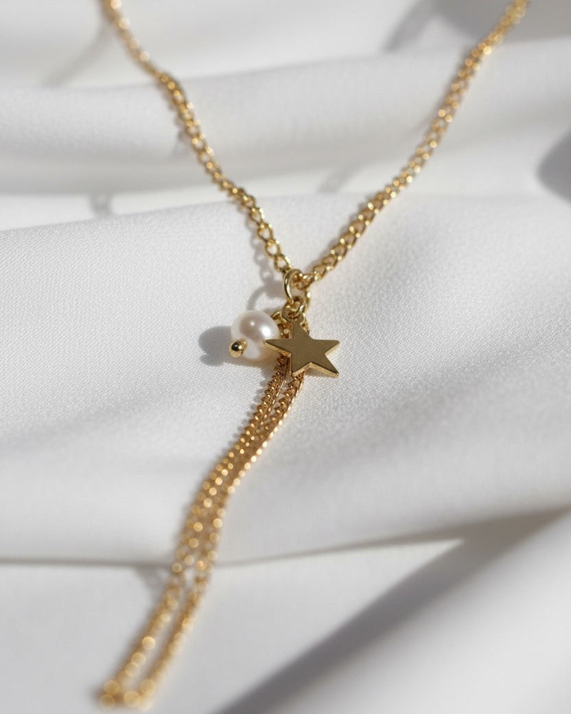 Delicate 18k stainless steel, gold-plated necklace, adorned with a small star shaped pendant and a single pearl, giving it a sophisticated touch.