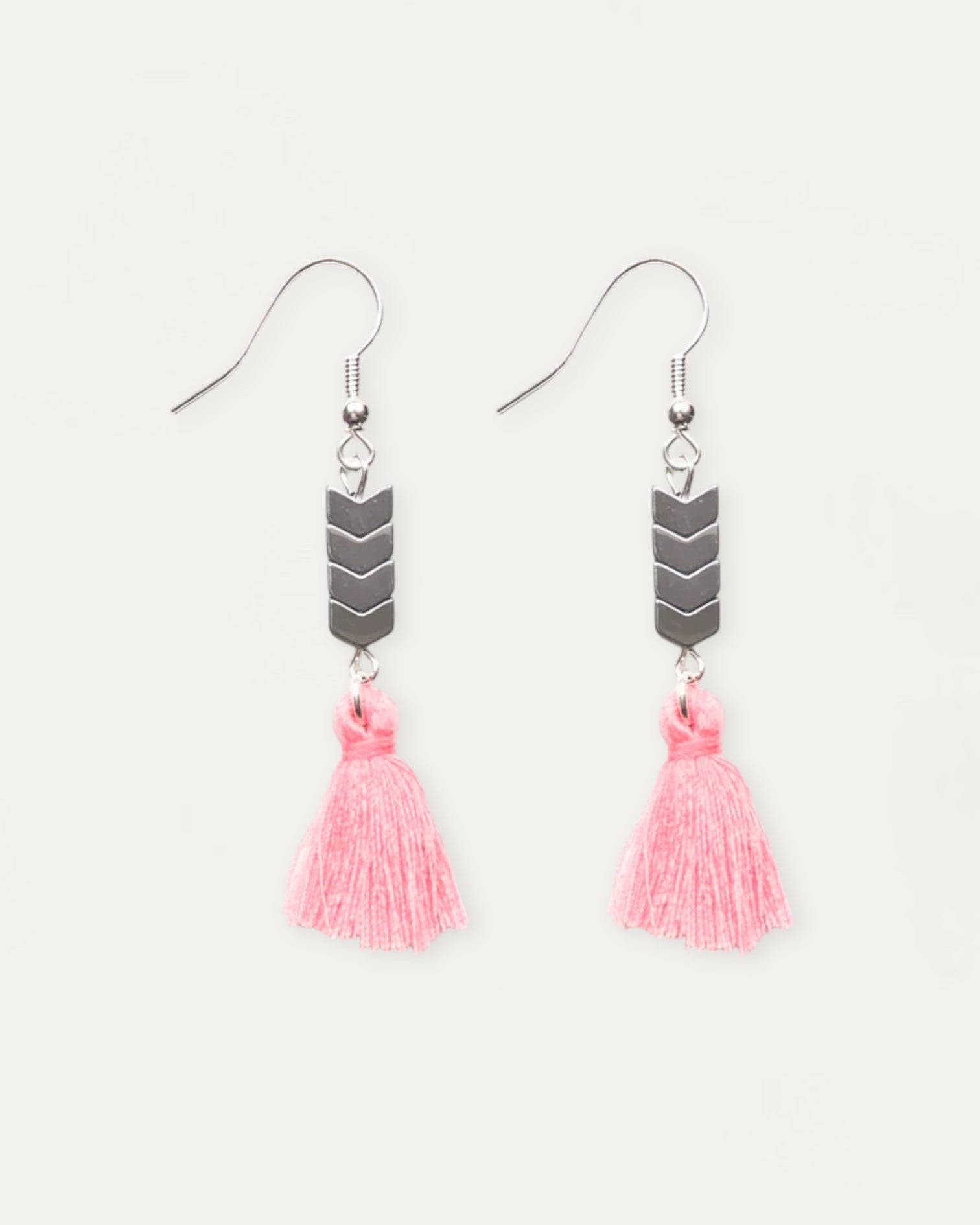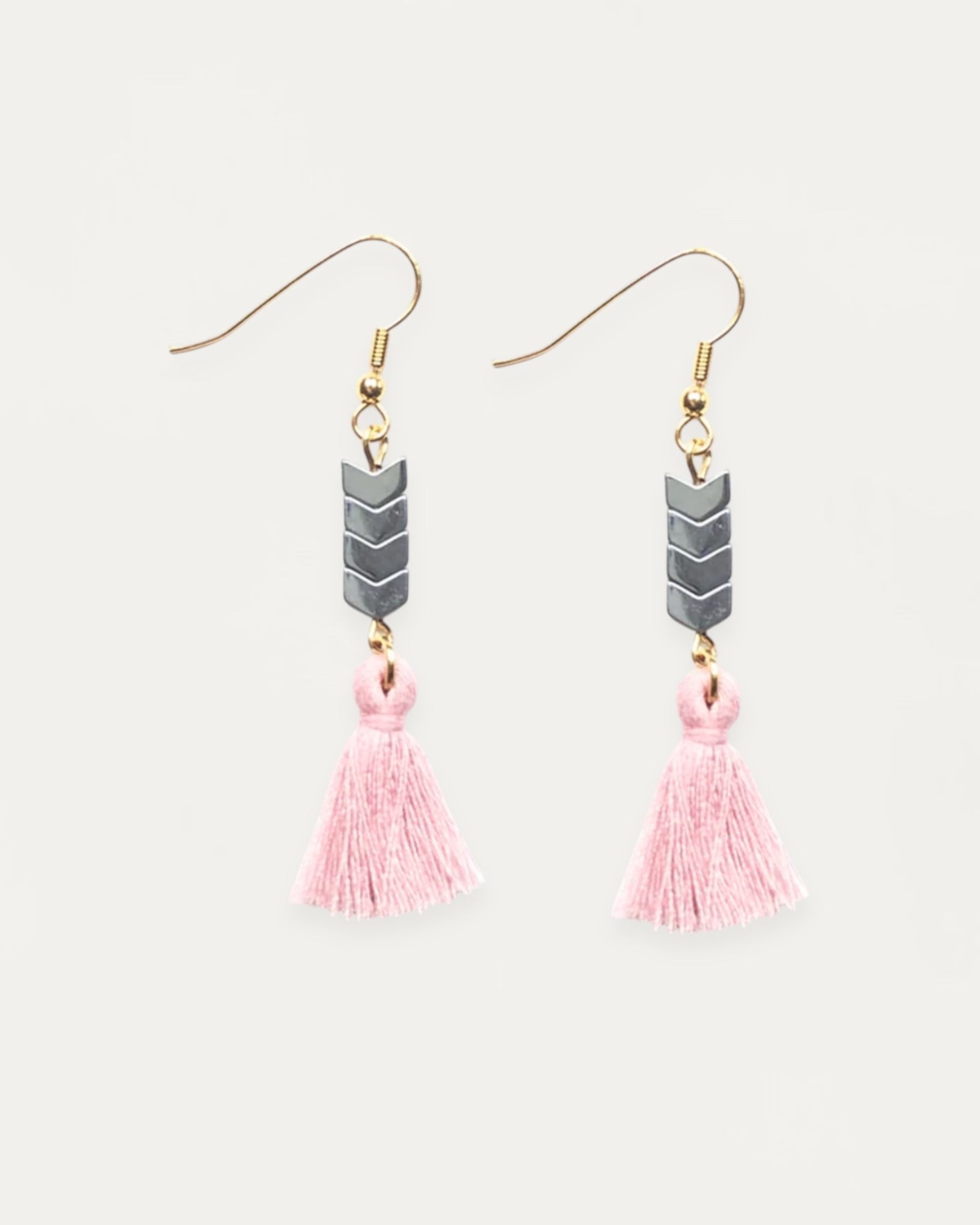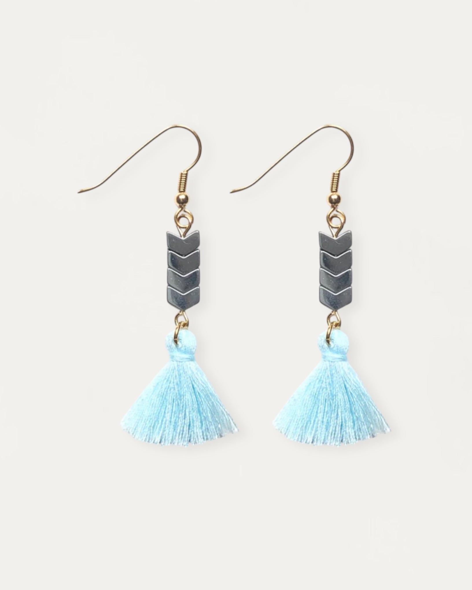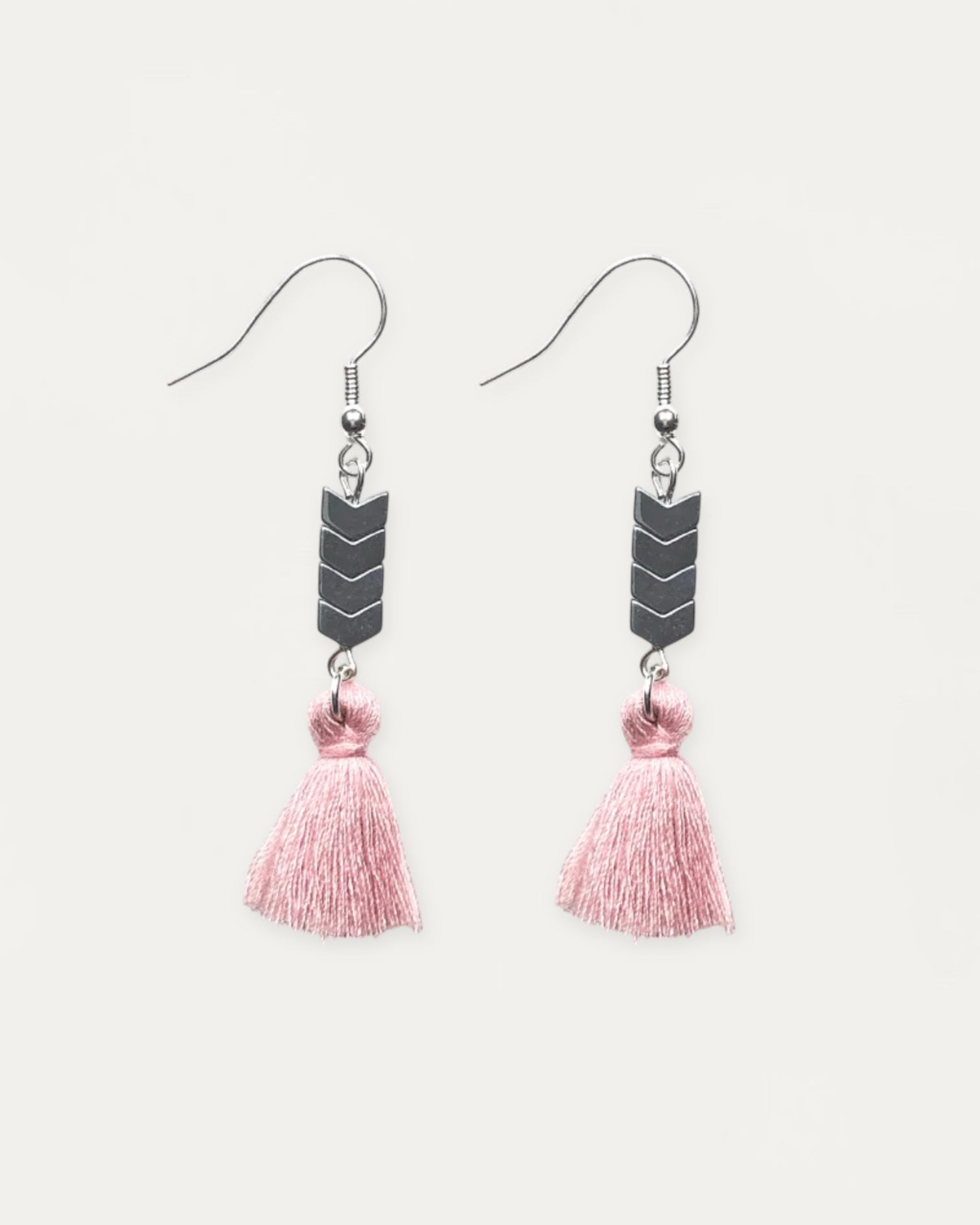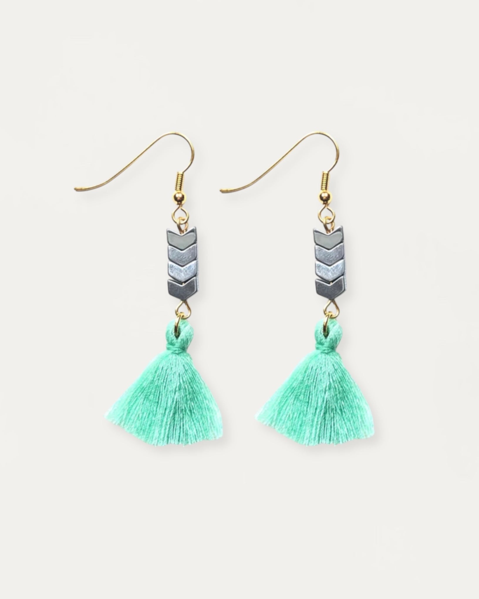 These tassel earrings are made by hand with cotton thread and with a nice piece of fish tail on top of light gray. The hooks for earrings are silver or gold tones and are free of nickel. The tassels are of cotton thread.