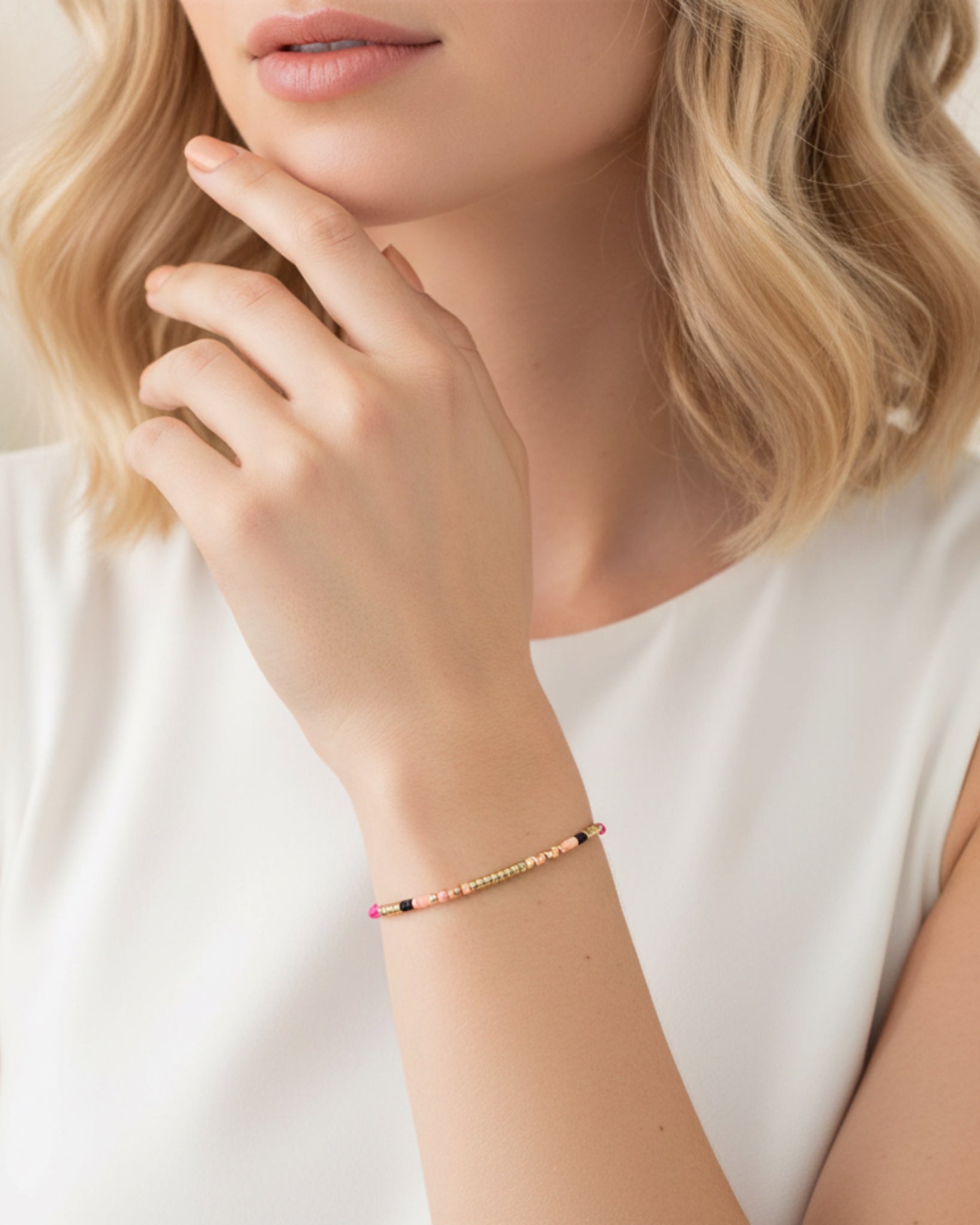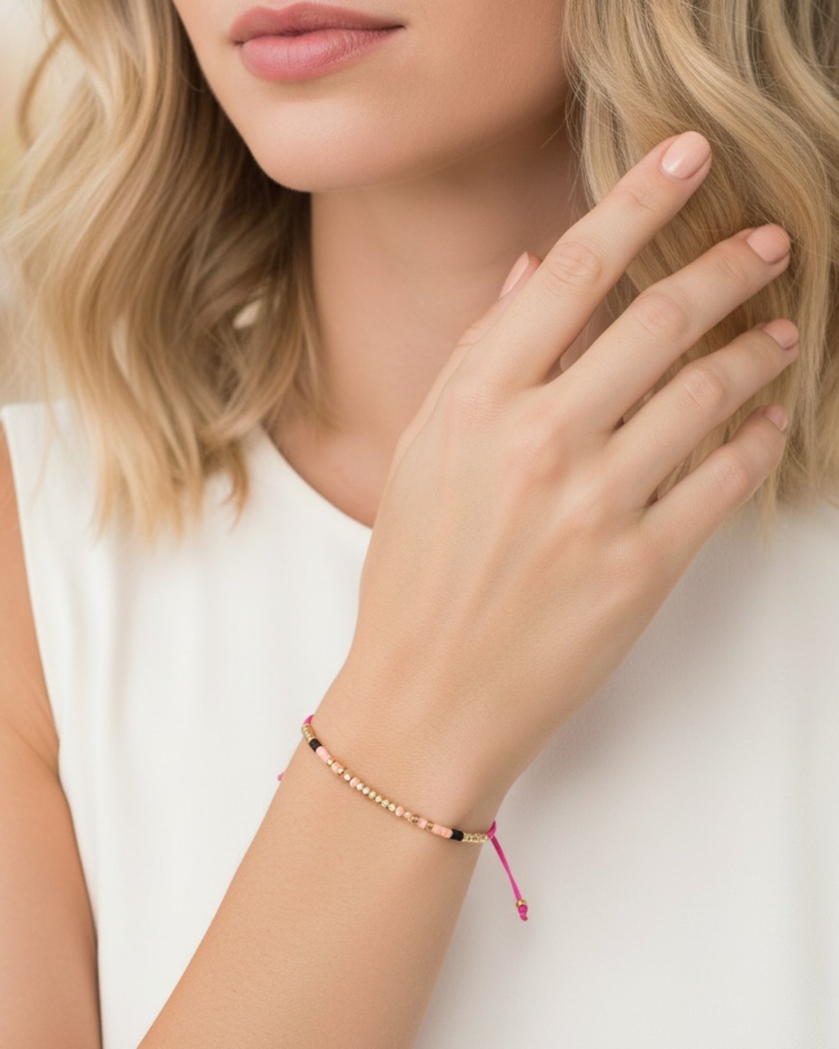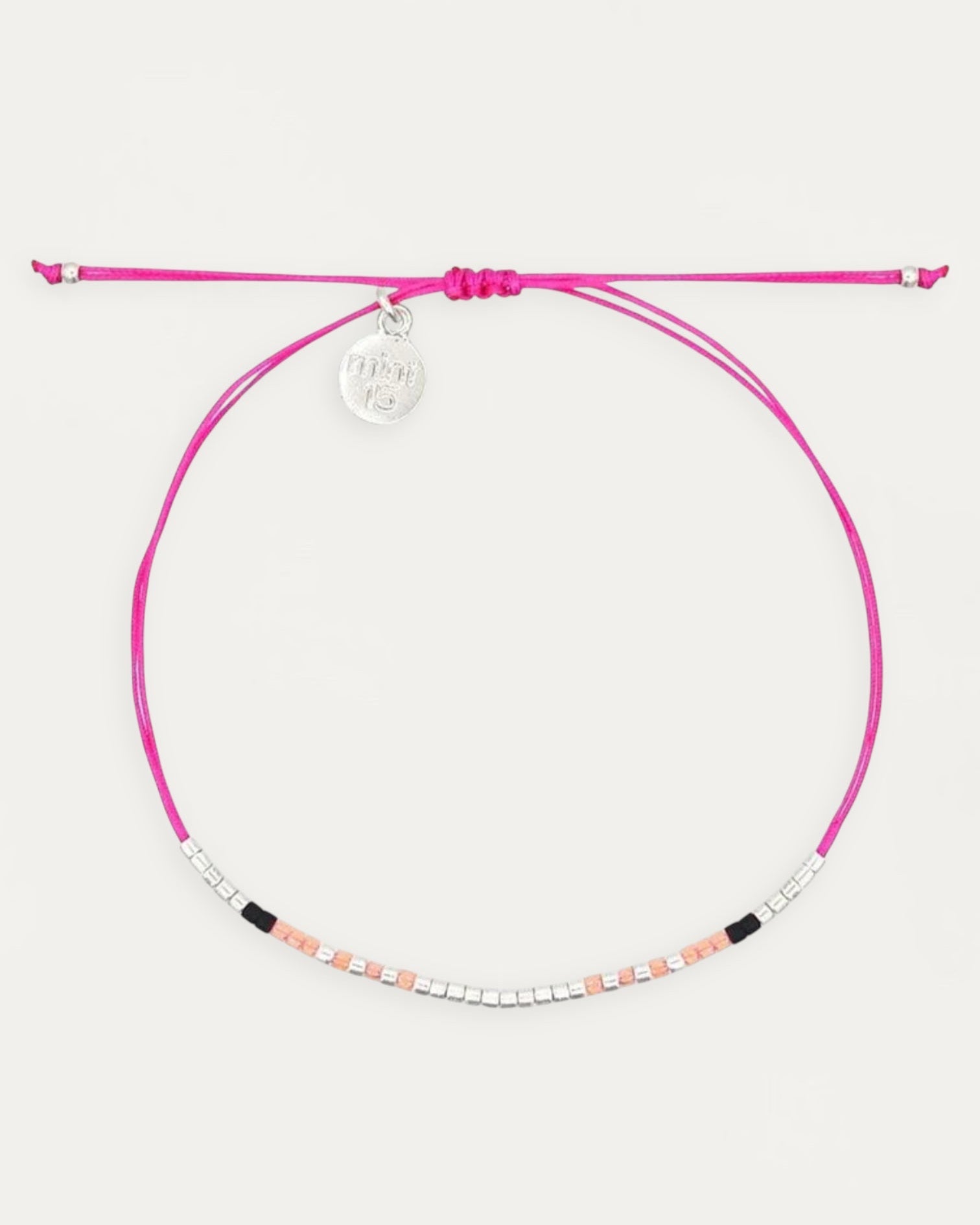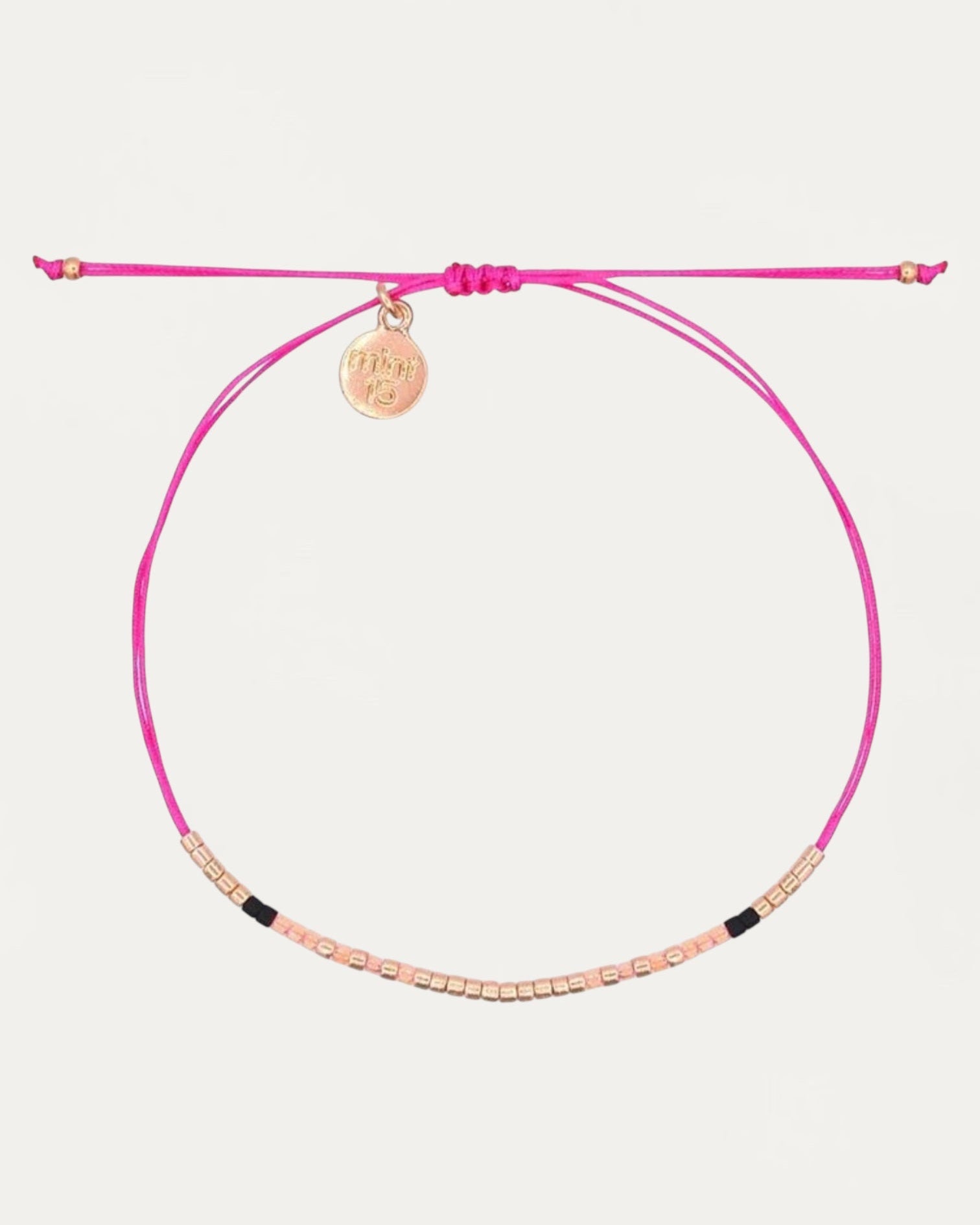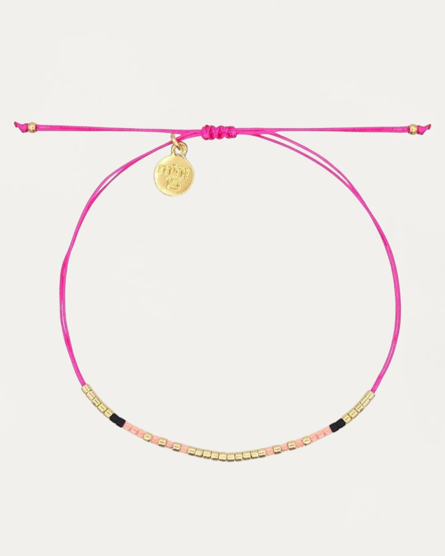 Cute bracelet made from plated Miyuki beads and delicate hot pink cords with a slight shine.
