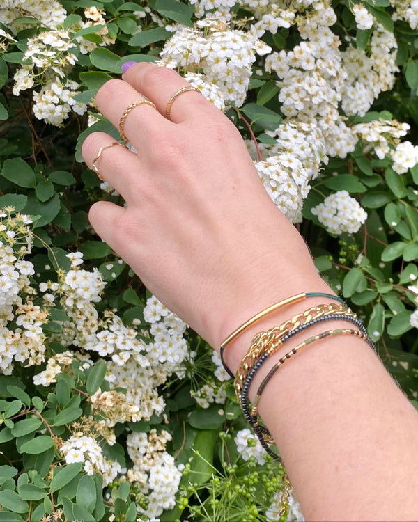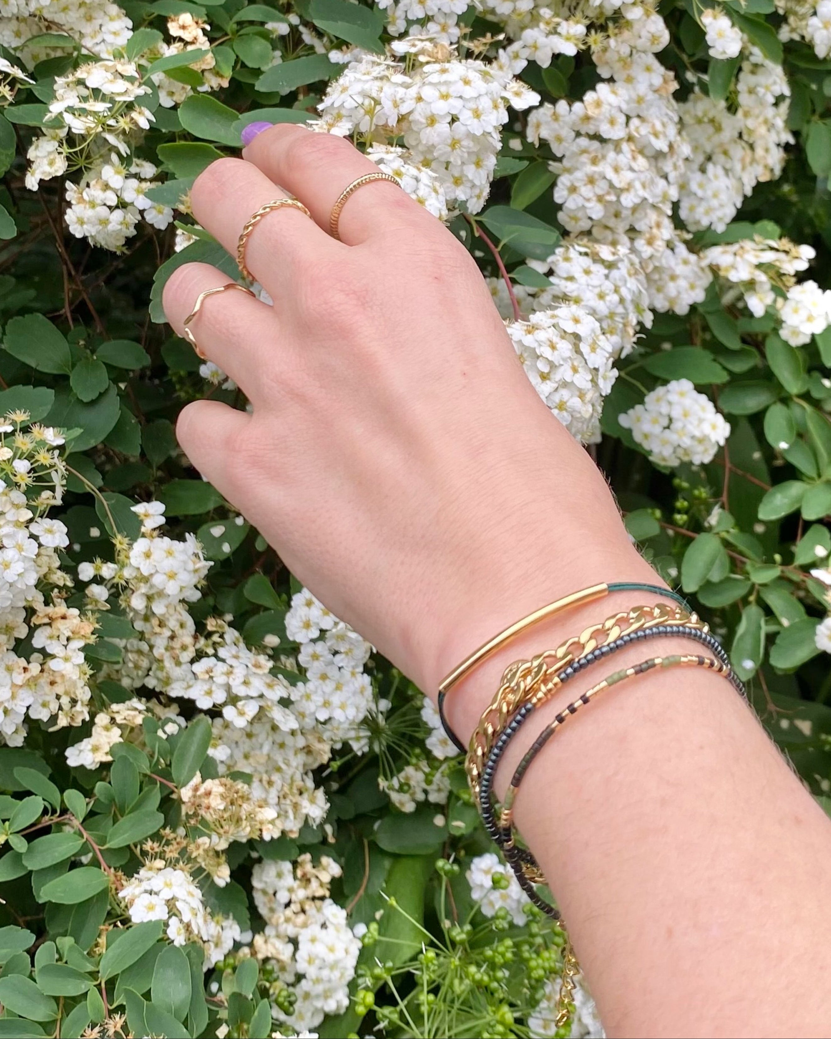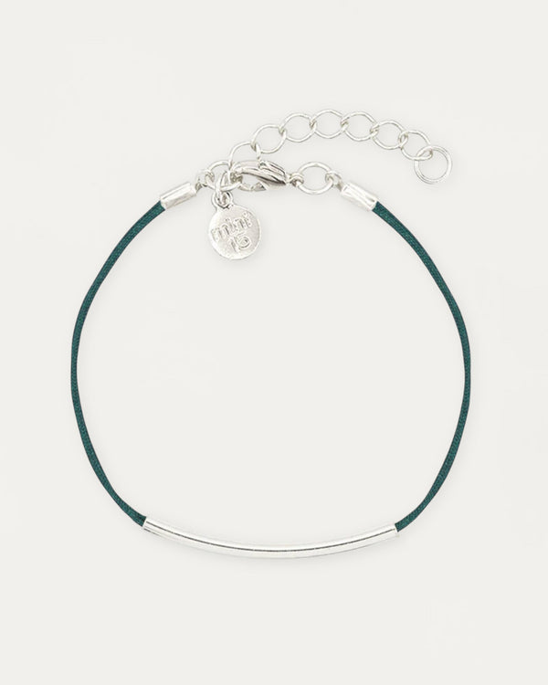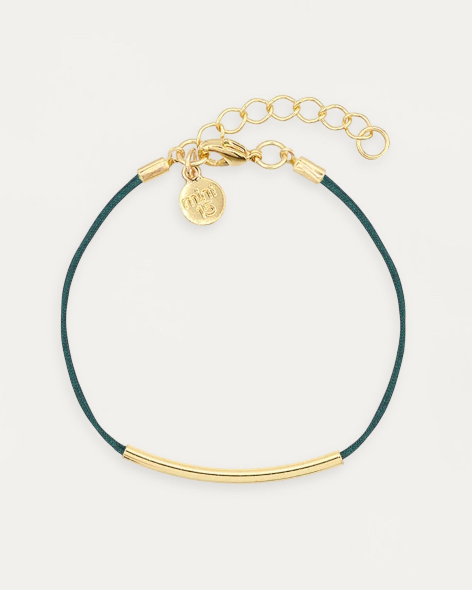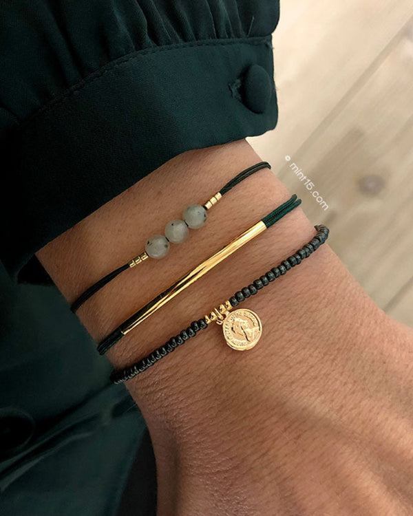 Bracelet of 2 laces in dark green colors, with a gold or silver tube around. Super chic!