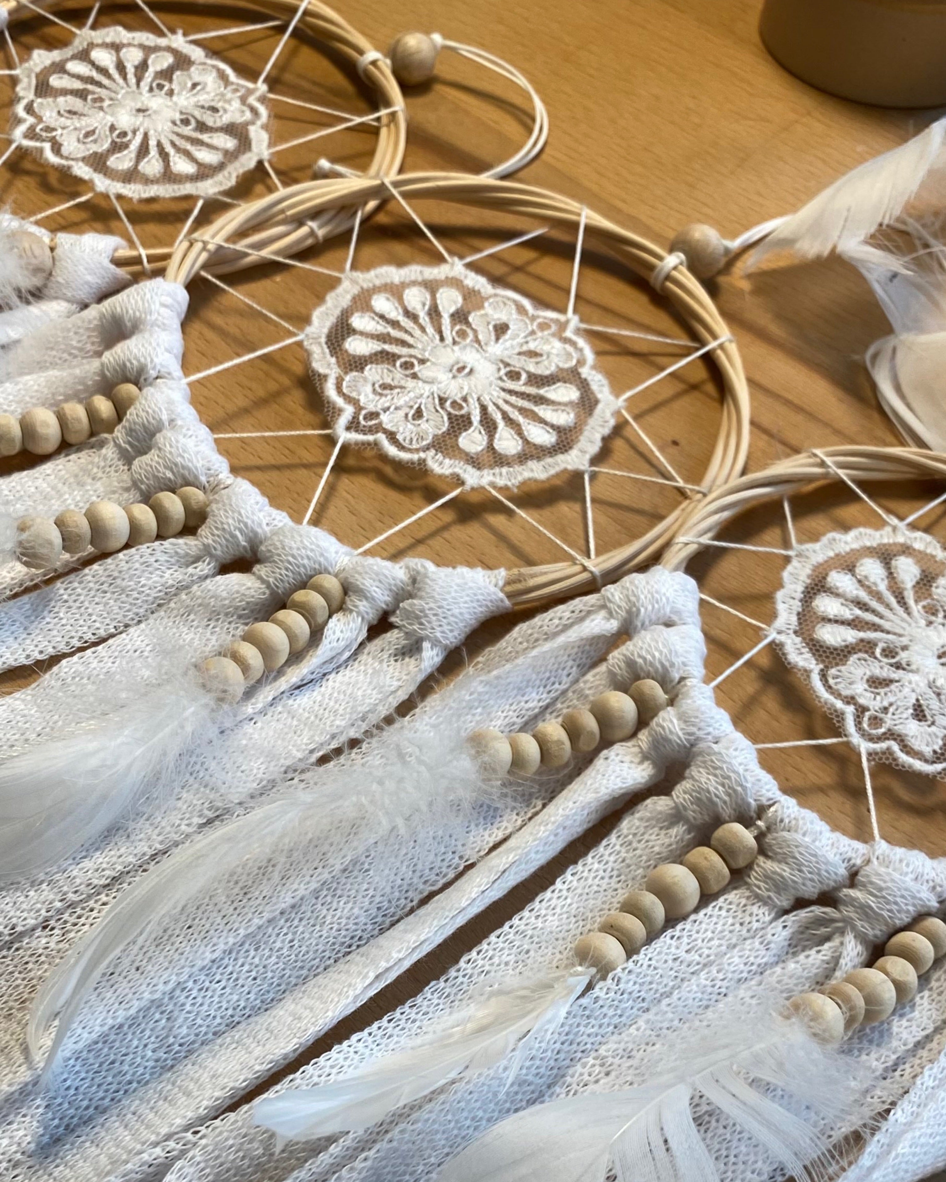 We made this dream catcher with a wooden hoop, cotton ribbons, wooden beads and feathers. The mandala is woven by artisans in Spain.
