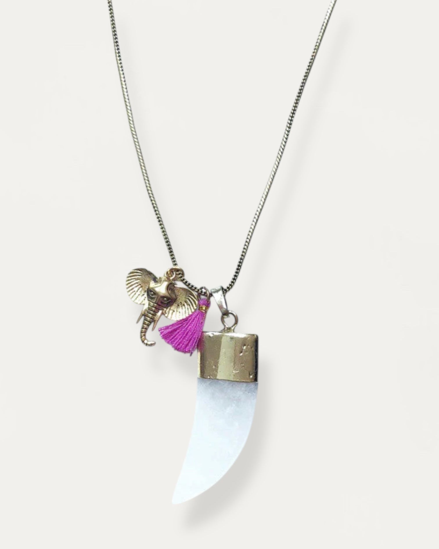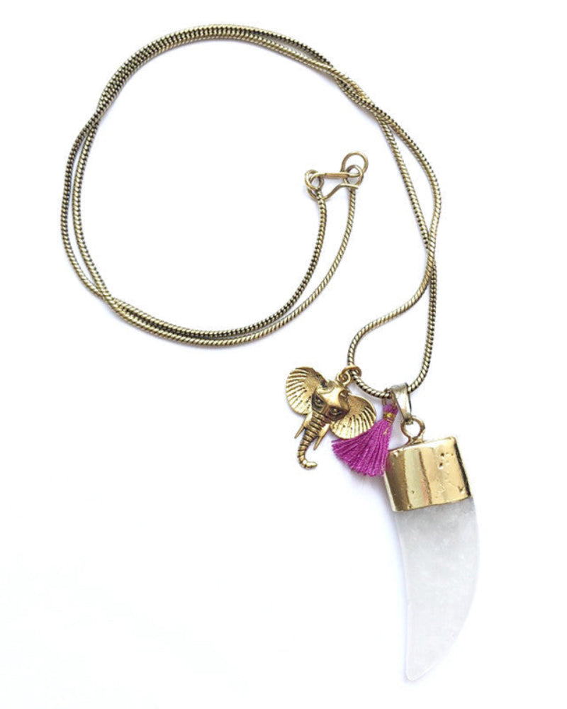 Gold metal chain with an Indian elephant charm and white quartz.