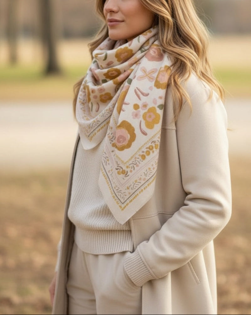 Its large size (130 x 130 cm) allows for a multitude of styles: around the neck or even as a stole over the shoulders. A versatile and refined accessory that appeals to customers looking for original and durable pieces.